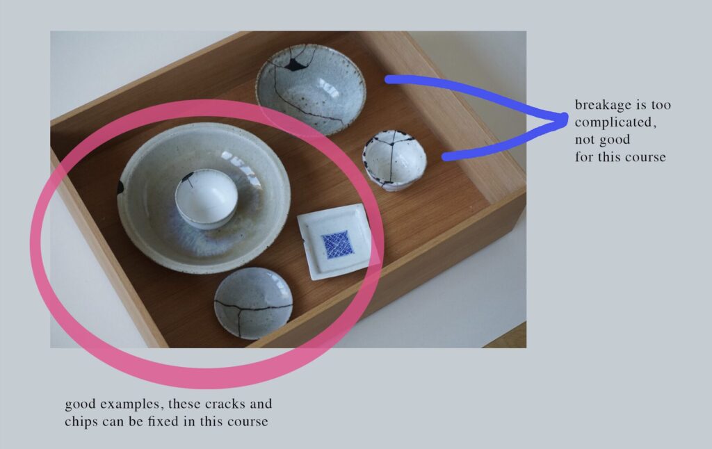 Introduction to Kintsugi, materials, and tools. Going over safety and overall process. We will start repairing your piece.